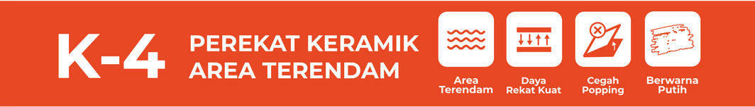 - Daya rekat kuat sehingga keramik/granit (homogeneous tile)/batu alam/mozaik/marmer tidak mudah turun/merosot saat diaplikasikan secara vertikal pada permukaan area terendam.